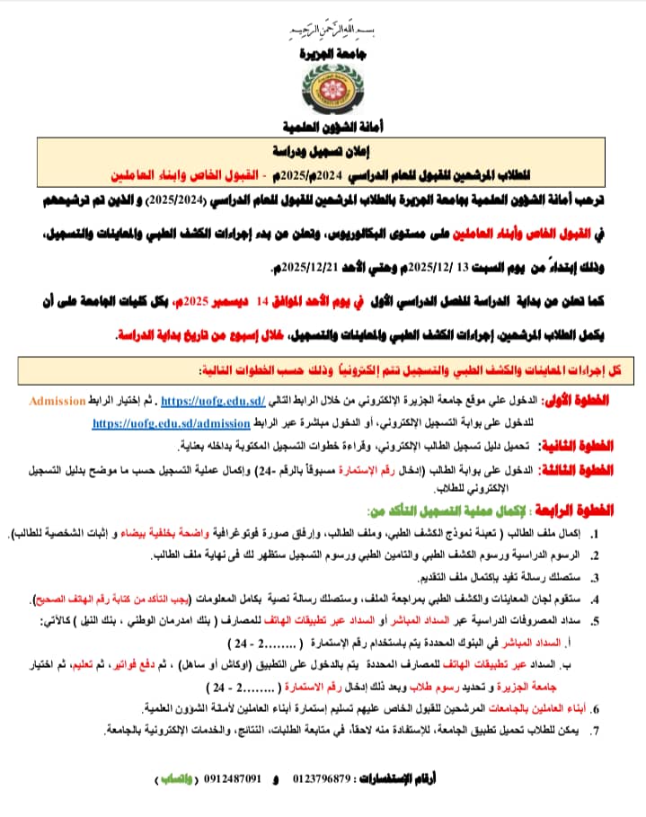 الرئيسيةأخبارإعلان تسجيل ودراسة للطلاب المرشحين للقبول للعام الدراسي 2024م – 2025م / القبول الخاص وأبناء العاملين إعلان تسجيل ودراسة للطلاب المرشحين للقبول للعام الدراسي 2024م – 2025م / القبول الخاص وأبناء العاملينبواسطة geziranews / ديسمبر 13, 2025 أمانة الشؤون العلميةإعلان تسجيل ودراسة للطلاب المرشحين للقبول للعام الدراسي 2024م – 2025م / القبول الخاص وأبناء العاملين الصورة الثانية للخبر: العنوان: 1000136517-1