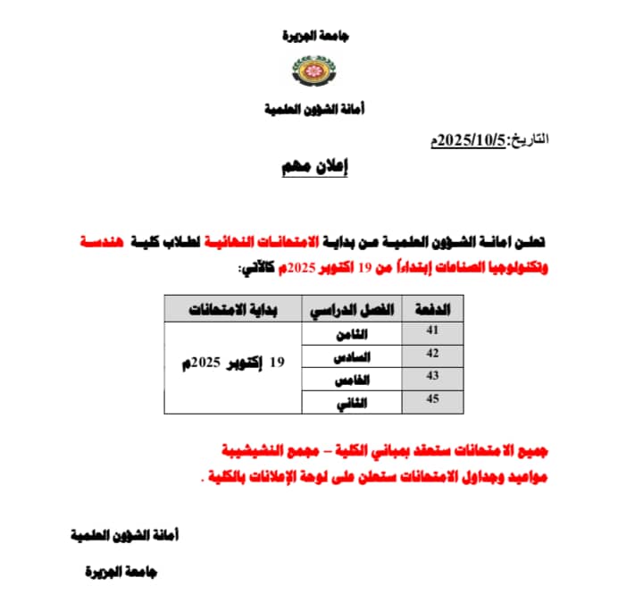 الرئيسيةأخباربداية الامتحانات لطلاب كلية هندسة وتكنولوجيا الصناعات بداية الامتحانات لطلاب كلية هندسة وتكنولوجيا الصناعاتبواسطة geziranews / أكتوبر 8, 2025 بداية الامتحانات لطلاب كلية هندسة وتكنولوجيا الصناعات تعلن أمانة الشؤون العلمية بجامعة الجزيرة، عن بداية الامتحانات لطلاب كلية هندسة وتكنولوجيا الصناعات للدفعات ” ٤١، ٤٢، ٤٣، و ٤٥”. الصورة الثانية للخبر: العنوان: 1000058906