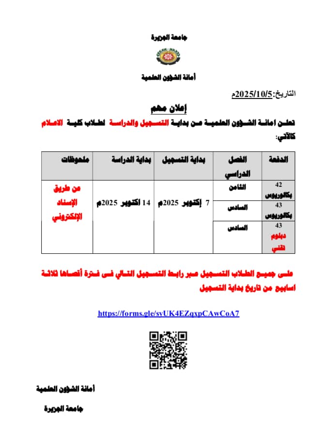 الرئيسيةأخباربداية التسجيل والدراسة لطلاب كلية الإعلام بداية التسجيل والدراسة لطلاب كلية الإعلامبواسطة geziranews / أكتوبر 8, 2025 بداية التسجيل والدراسة لطلاب كلية الإعلام تعلن أمانة الشؤون العلمية بجامعة الجزيرة، عن بداية التسجيل والدراسة لطلاب كلية الإعلام، للدفعات ” ٤٢، ٤٣” – بكالوريوس، و ” ٤٣” دبلوم تقني. الصورة الثانية للخبر: العنوان: 1000058914