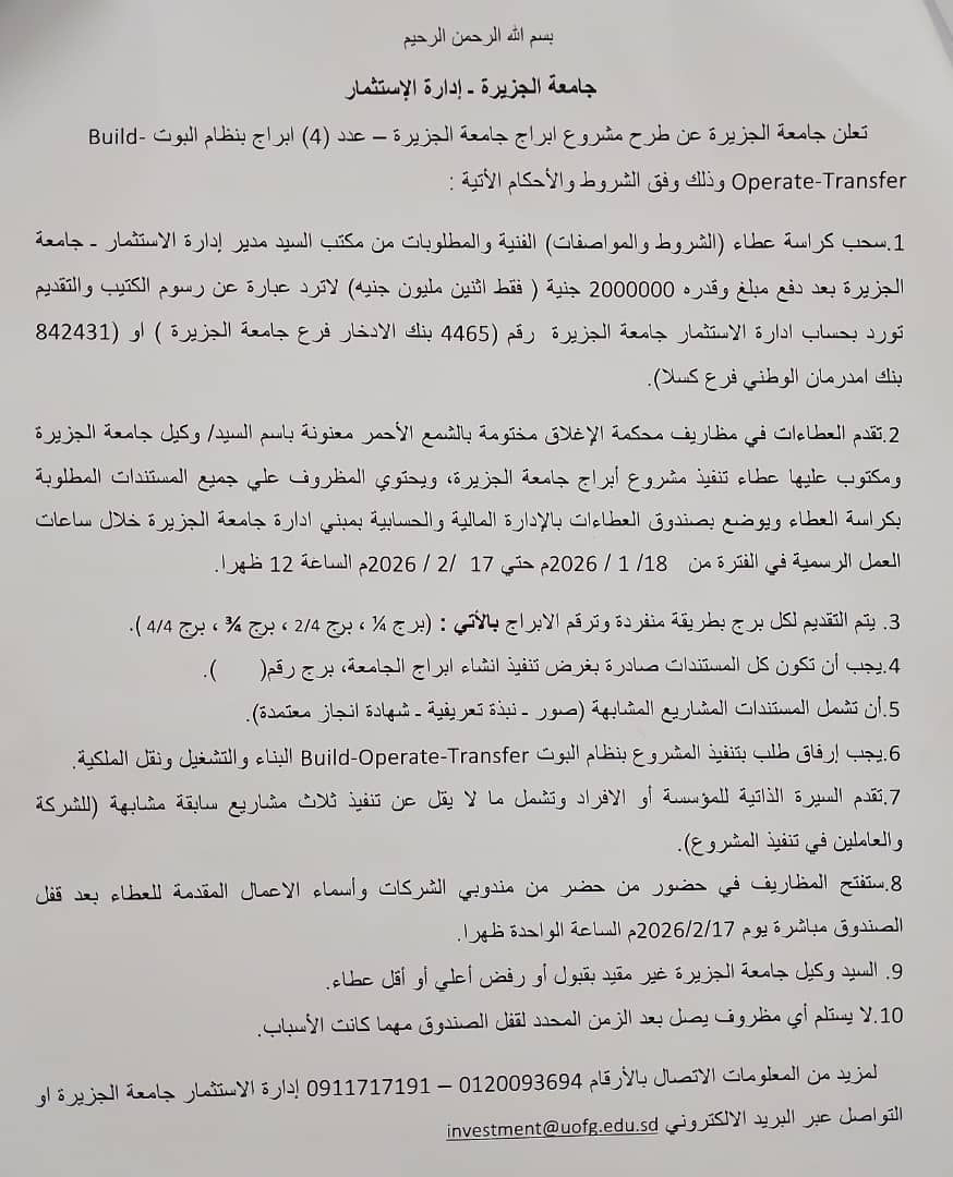 الرئيسيةأخبارجامعة الجزيرة – إدارة الاستثمار #إعلان جامعة الجزيرة – إدارة الاستثمار #إعلانبواسطة geziranews / يناير 13, 2026 جامعة الجزيرة – إدارة الاستثمار#إعلانتعلن جامعة الجزيرة عن طرح مشروع أبراج جامعة الجزيرة – عدد ( 4) أبراج بنظام البوت – Build – Operate – Transfer الصورة الثانية للخبر: العنوان: 1000175076-1