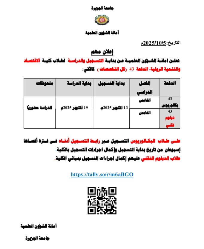 الرئيسيةأخبارعن بداية التسجيل والدراسة لطلاب كلية الاقتصاد والتنمية الريفية عن بداية التسجيل والدراسة لطلاب كلية الاقتصاد والتنمية الريفيةبواسطة geziranews / أكتوبر 11, 2025 عن بداية التسجيل والدراسة لطلاب كلية الاقتصاد والتنمية الريفية تعلن أمانة الشؤون العلمية بجامعة الجزيرة، عن بداية التسجيل والدراسة، لطلاب كلية الاقتصاد والتنمية الريفية، الدفعة ” ٤٣” – كل التخصصات. الصورة الثانية للخبر: العنوان: 1000063197