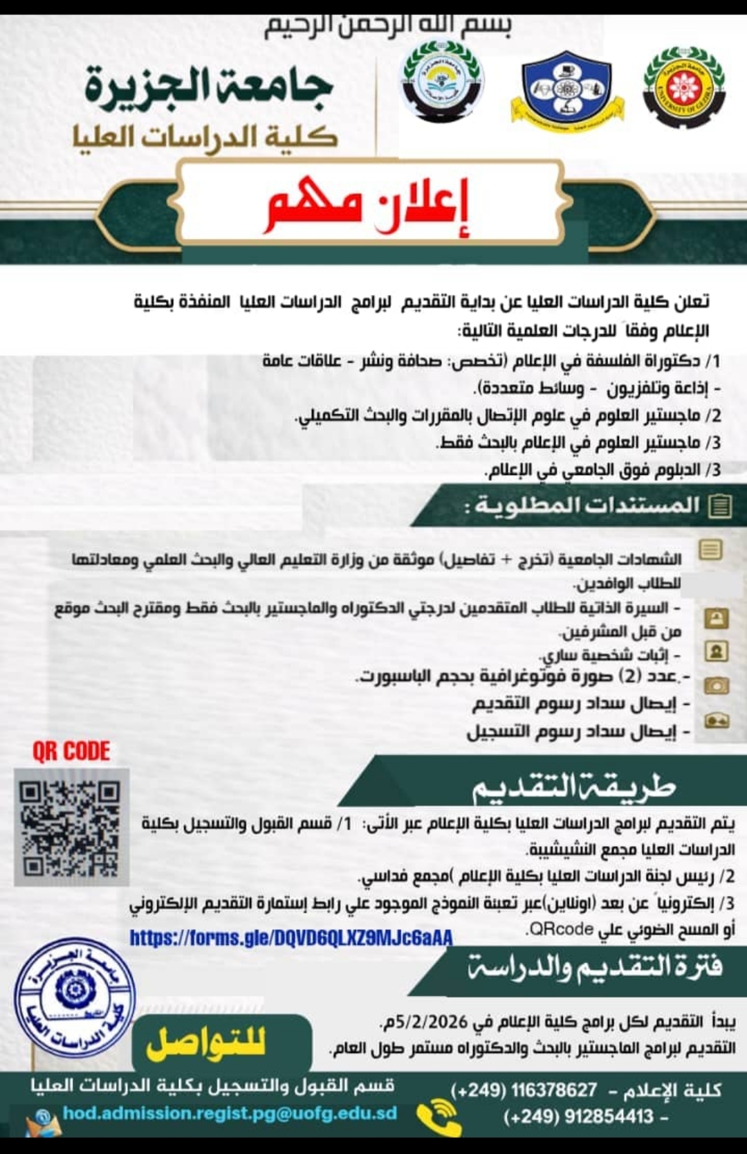 يبدأ التقديم لكل برامج كلية الإعلام في 5/2/2026م.